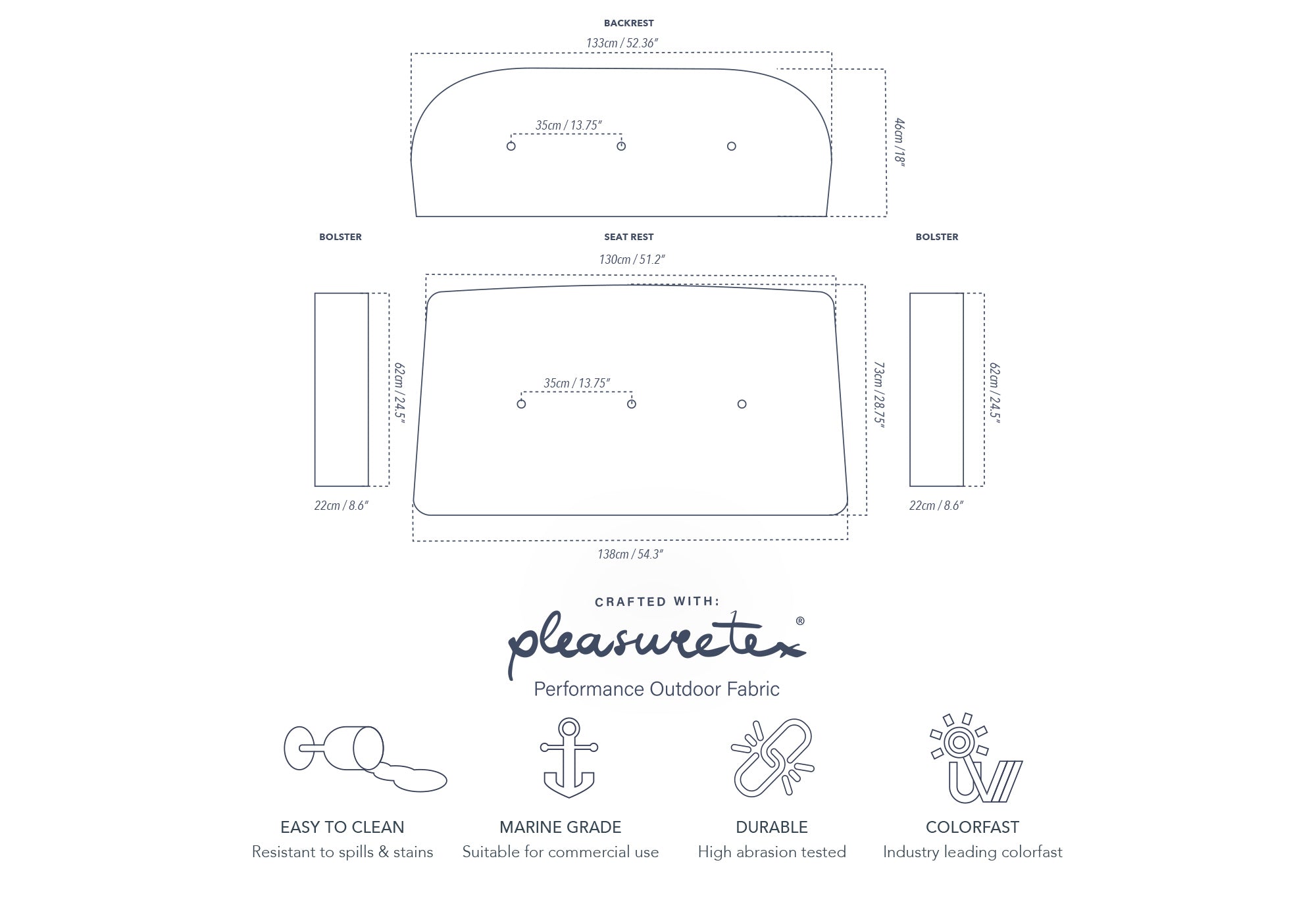- Fabric: Pleasuretex® acrylic