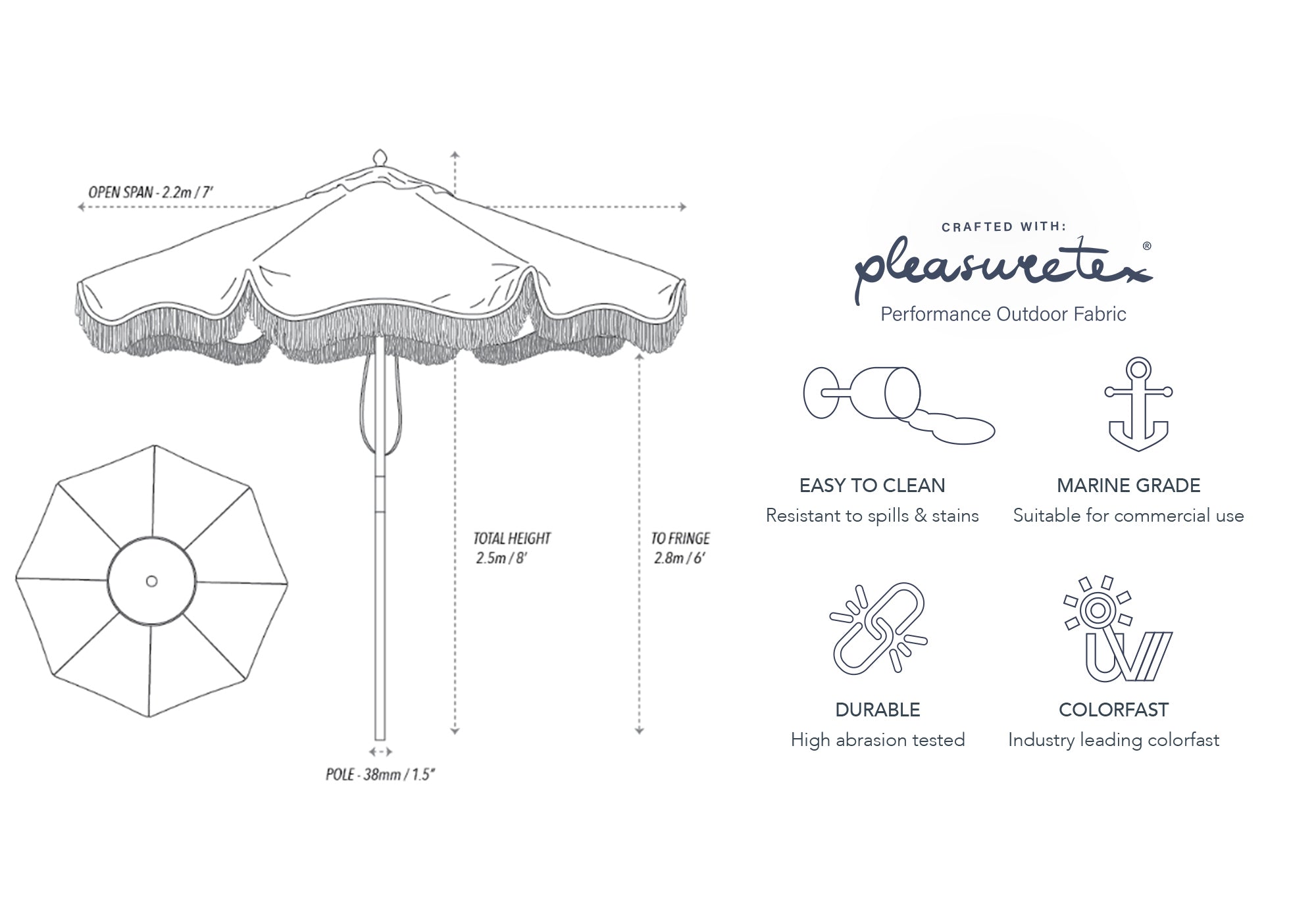 The Market Umbrella offers timeless style with modern function. With its generous canopy, effortless setup, and removable cover, it’s the perfect shade solution for gardens, patios, or by the pool. Made with our exclusive Pleasuretex® fabric, it’s designed to resist water, UV, and mold—ensuring long-lasting beauty outdoors.